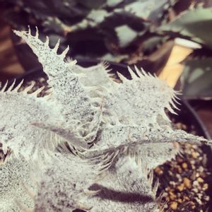 白いディッキアの中で一番のお気に入り。 細身な葉、鋸歯、濃いトリコーム、葉の巻き込み、全てのバランスが良い。 株元からお子様も顔を出している。 ディッキア マルニエル ラポストレイ エステべシー
