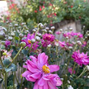 我が家の秋明菊と奥のピンボケはお隣のチェリーセージ🍒💖 まだまだ秋明菊は満開まで時間がかかりますが〜ココから座って見るとキレイなの♬😍