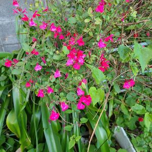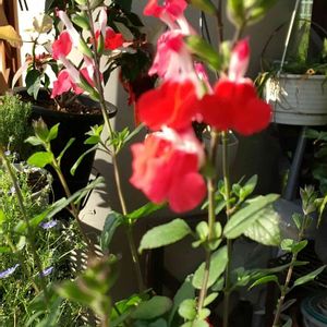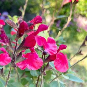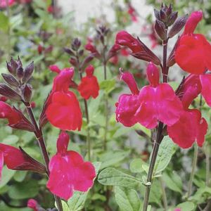 チェリーセージ シソ科 アキギリ属 昨年植えた チェリーセージ が西側のフェンス 沿いに群生で 咲き始めました🙌