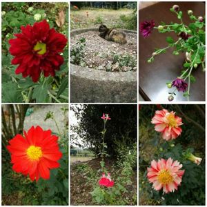 今日のお庭の様子💕 ↑夏のお花片付けたら早速ちびが・・よく見たらお尻のとこにちっちゃいナスタチウム🌼が💦植え替えました😅 ↖↗やっと我が家にも菊の花🌼が咲き初めたので、早速仏壇へ🎵 ↓チェリーセージ分けてもらって上手く根付きました✌️でもまだいっぱい咲かない(ToT) ↙↘7月のダリアとは又違うお顔(^ー^)