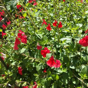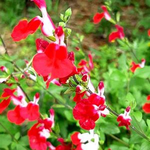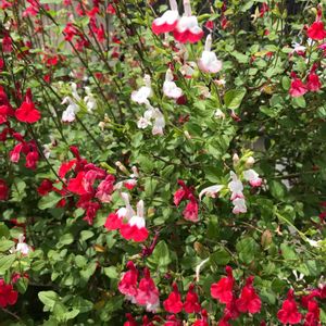 チェリーセージ ホットリップス 白とのツートンカラーのはずだけど、気温の高低で赤、ツートン、白と咲き色が変わります‼️ 真夏には赤と白のコントラストが楽しめるでしょう☘️