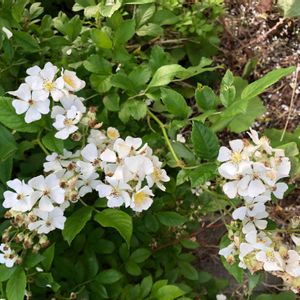ワイルドローズ 野バラ トゲがたくさんある野生のバラ、ピンクのツボミから真っ白いお花が房状に咲く姿💕 黄色いシベもたまりません(^^)