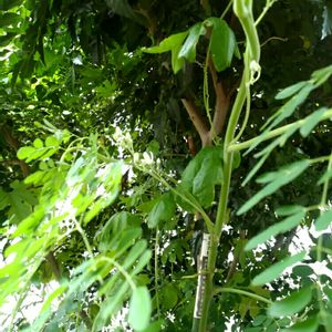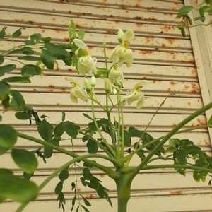 ■モリンガ(ワサビノキ) 「生命の木」や「奇跡の木」などと呼ばれて注目を集めるスーパーフード素材。近頃は沖縄でも栽培されているらしい。 モリンガの成長には大量の二酸化炭素CO2が必要で、一般の植物に比べて20倍以上の二酸化炭素を吸収することから、温暖化対策にも有効というなかなか有用な植物です。大阪で1本植えたところでたかが知れてますが、地球に貢献ということで。 最高気温17℃、最低気温3℃ 以下、wikipediaより ワサビノキ(学名:Moringa oleifera Lam.)は、ワサビノキ科唯一の属であるワサビノキ属の1種であり、本属で最も広く栽培されている。属名のモリンガで呼ばれることもあり、日本で食材として扱う事業者やその商品名でも「モリンガ」と称することが多い。 ・特徴 ワサビノキは、成長が速い樹木であり、環境に応じて常緑性または落葉性を示す。成木は高さ10~12メートル、直径45cmにまで達する。樹皮は白みがかった灰色で、厚いコルク層に覆われている。若い芽は、紫や緑がかった白の毛むくじゃらの樹皮を持っている。樹冠は開けており、枝は脆く垂れやすく、葉は3回羽状複葉。 花は両性で、長さ約1~1.5センチメートル、幅は約2センチメートルで、香りがある。花弁は不同で、薄い縞模様のある黄色がかった白色。長さ10〜25センチメートルほどの広がった垂れやすい円錐花序につく。花梗は細く、有毛。花は植えて6カ月以内に咲き始める。開花は涼しい地域では4月~6月に見られ、気温や降水がより安定した地域では1年に2度あるいは1年中見られる。 果実は三角柱型の蒴果で3室、長さ20~45センチメートル、茶色に熟し、ぶら下がる。種子は直径約1センチメートル、球形で黒褐色、3枚の白みがかった薄い翼を持ち、風または水によって散布される。 栽培下では、葉や果実が手の届く範囲につくよう、高さ1~2メートルに手入れされることが多い。