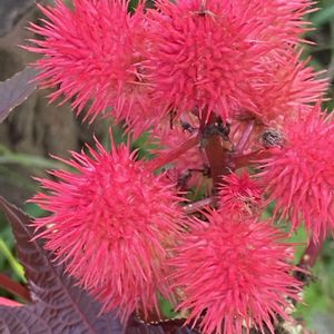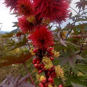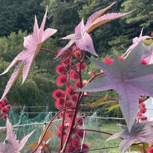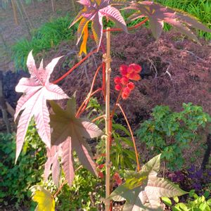 トウゴマ(唐胡麻) トウダイグサ科 原産は、アフリカ北東部と考えられているが、現在では世界中に分布している。 中国から平安時代初期に、アメリカから江戸時代末期に導入された。西日本を中心に逸出し、野生化している。 特徴: 全体無毛で通常暗紫色を帯びる。茎は円柱形で直立し、まばらに分岐して高さ2mに達する。 葉は大型で掌状に5〜11に裂け、縁に鋸歯があり、長い柄で互生する。茎の頂と葉腋に長さ20cmほどの花序を付け、雌花を上部に、雄花を下部につける。 さく果には通常刺があり、中に長さ13mmほどで光沢のある3種子を含む。 種子は40-60%の油分を含んでおり、主にリシノリンなどのトリグリセリドを多く含むほか、毒性⚠️アルカロイドのリシニンも含む。