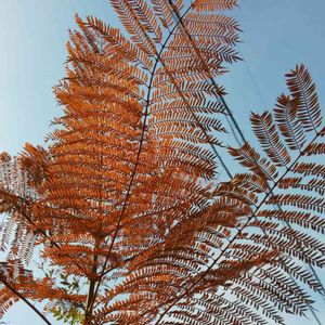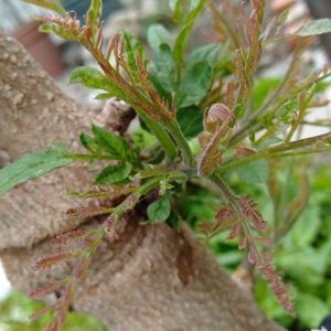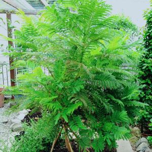ジャカランダ: 新芽が出だしました。 今年は根っこの方から生き良いよく生えてきたので、あまり下から出た新芽はカットしました。
