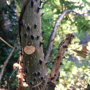 伊豆、城ヶ崎海岸の遊歩道で、トゲトゲの木がたくさんありました。足を滑らしてもこの木に掴まったら大ケガ😫です。 葉痕が無邪気に笑って👶います(怖い) カラスザンショウです。