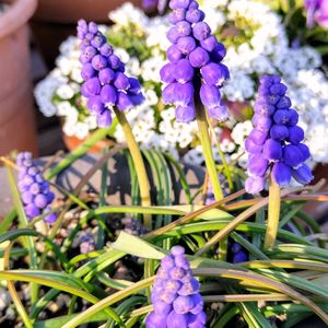 あっ!もうお昼だ🍴🌞 午前中、薄墨桜はそろそろ咲いただろうかと行ってみたら まだ咲きかけでした🤩 💜ムスカリ💜 ヘタったニラの葉みたいなのが冬中あって やっと紫の花がニョキっと伸びてきました💜 可愛い🔔ベル型の花が とってもキュート🤗 地植えのもあるけど 撮りにくいから この鉢植えのを アリッサムの前に置いてパシャリ📸 春が来ましたね🌸