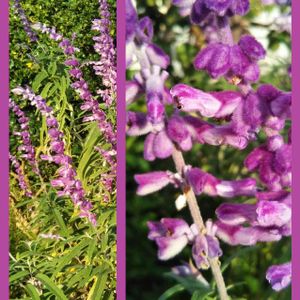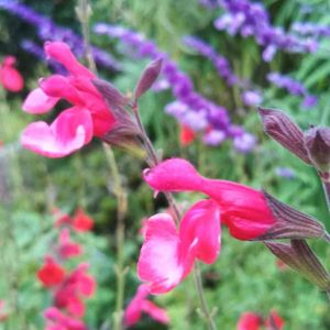 🌸チェリーセージ🌸 💠アメジストセージ💠 チェリーセージはずーっと咲いてます。 真冬だって少し咲いてます。 大きく広がって伸びるので 手でポキポキ折ってます。 背後には紫が濃くなってきた💠アメジストセージがー! 素敵なツーショットになりました😉