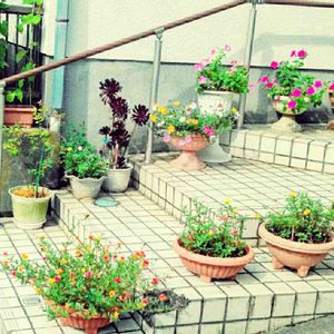 買い物帰りに、通り道のお宅の裏玄関の階段に、 お花がいっぱい咲いています。