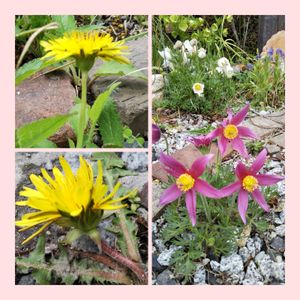 ↖️庭に自生している ニホンタンポポ💛 これからは、抜かずにおこうと思います。 ↙️同じく自生している セイヨウタンポポ💛 ➡️手前のピンクの翁草は 2年目でやっと花が咲きました🌺 奥の白は こぼれ種で あちこちに…🌱🌱