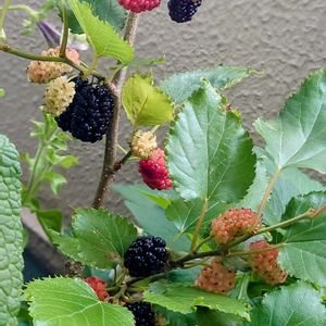 🍇鉢植えで桑の木幾つかあって実がついたのはこの木だけ 大きめプランターに植えてあります 黒くなったら食べ頃😋 これは少し控えめな甘さ ちょっと甘味足りないですね 盆栽風にすると実が小さくなり甘味も凝縮されとても甘くなります 小さめ鉢に植え替えしましょう🍇