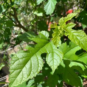 こちらも勝手に庭に生えて1mほどに成長中です まるで虫食いみたいな葉の形 何の木でしょうか? 桑の木と教えていただきました。 ありがとうございました。