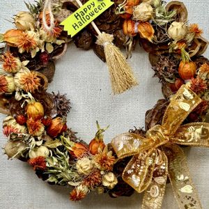 今年のハロウィン用リース 庭で育てたニゲラ、紅花、クチナシ、バラの実などを使っています 台は去年の秋に作った木の実のリース (2枚目)こんなふうに飾っています フェルトと木の枝で作った🎃がお気に入り(毎年使いまわしている…)