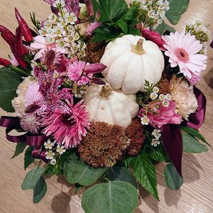 🎃Happy Halloween🎃 今日のお花 カボチャ ①白のミニカボチャのフラワーアレンジメント ②収穫の秋 バラクライングリッシュガーデン ③番外編:ハロウィンのスィーツ等 下の2枚はお教室で 全て過去pic