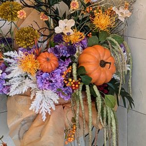 気づいたら1300picでした〜❣️ 皆さま、これからもよろしくお願いします🎵 昨日、我が家に遊びに来てくれた友人から、思いがけず、ハロウィン🎃のブーケ💐をもらいました♡ しばらく、花を買ったり飾ったりしていなかったので、とても嬉しかったです🧡 2枚目は玄関のディスプレイ🎃👻 先日のイベントで、友人から獅子柚子(鬼柚子)をいただいたので、おもちゃかぼちゃ代わりに飾りました✨邪気を退治してくれる言い伝えもあるそうです❣️❣️ 眼光のするどいフクロウ🦉は、母の手作りです✨