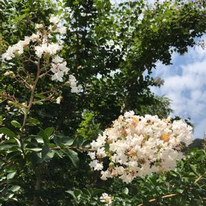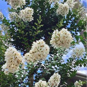 サルスベリ✨ 今日出会ったふたつ目の白いお花💞 百日紅って名前の漢字からも 紅色イメージですが 白も素敵でした👍 高い木の上でまだ咲き始めです🤗 今日も見ていただいてありがとうございます🙏✨ おやすみなさい〜😴💫