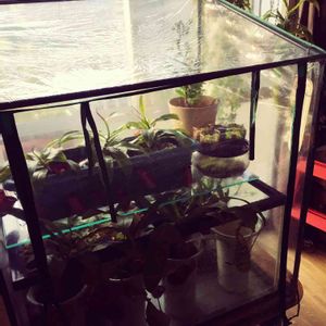 冬を越すための簡易温室・90cm水槽版、ほぼ完成! これにオイルランプを入れたら冬でも20℃いける。 (^ ^)今はまだロウソクを使ってるんですよ。 不経済的で4時間どころか2時間で消えちゃうから夜中に温度と湿度を管理しに来なきゃならないの。