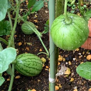 おはようございます😃 外は☔️が降ったりやんだり😵💫雨のおかげでしょうか? 先日、夫が楽しそうに蒔いてた こだますいかの🌱がのびのび成長しておりました! 🍉美味しくなーれとおまじない✨笑
