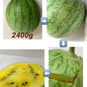 小玉スイカ🍉 2個目収穫🤗 重さを測って(2400g) ちょい置きしたら コロコロ😱コッツン😳パリン😭 新鮮すぎるぅ〜(*´罒`*) 収穫して3分後の出来事🥺 黄色のスイカが 現れました🥶 あれっ?甘みが‥‥足りない 。゚(゚´ω`゚)゚。