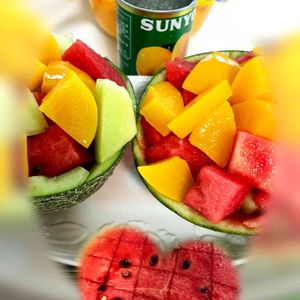 こだまスイカとメロンと桃缶で💓 小玉🍉輪切り 縦縦 横横 周りくり抜いて出来上がり·͜·♡