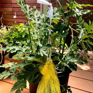 ベランダの小玉スイカ🍉 危惧していましたが、今朝方雨の中☔️ カラスに襲撃されていました💢 なんかいいスイカ、トマトのカラス対策ないですか?