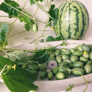 🌱プチキュー🥒 & 小玉スイカ🍉 家庭菜園 今年も育てた🥒と 西瓜🍉です。 サイズ感 わからないじゃん〜😅 50円 一緒に撮影してあります。 その50円が 見つけるの大変だったりして、、、😅