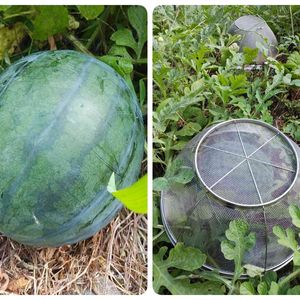 今年お母さんが植えたスイカはブラックレッドミニバルーン🍉 黒い皮の小玉スイカのようです😊 今年もこの様にカラス対策万全で👍もう収穫できそうなくらいの大きさと音も良いんですが😆今度こそ弦が枯れるまで我慢の子です😓 お母さん待ちきれず2回ほど収穫早まったので今度はお願いだから弦が枯れるまで待ってねと念押て😅3度目の正直今度こそ熟した🍉食べた~い😆🎶