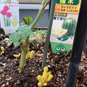 お久しぶりです。 小玉スイカは5cmしか育たなかったけれど、黄色い特別ゲストがいらっしゃいました。根を下ろして暮らしてる?てか、まだまだ出て来そうです。黄色のツブが土から顔出してる。