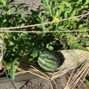 プランター栽培の 小玉スイカカメハメハ 藁のベッドで成長中です🤗