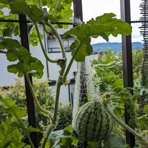 ベランダの小玉スイカ🍉 小さい方が割れていました。 一瞬カラスにやられたかと思いましたが、 ひび割れでした。 早速収穫して冷やして頂きます😀