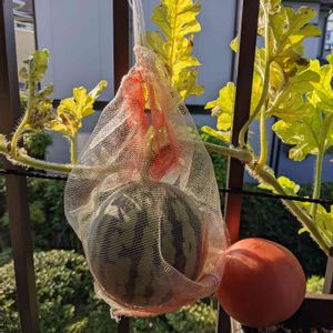ベランダの小玉スイカ🍉 赤い方やっと収穫しました😀 カラス避けにザルを被せてなんとか 育ちました。黄色い方はまだ小さいですがまだ育っています。