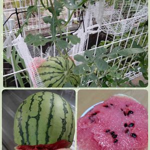 今年始めてプランター栽培の極小小玉スイカ714㌘は〜 うわっ!真っ赤に熟し👏👀味は甘くて皮近くまで食べられたよ〜 最高🎉🎉🎉🎶 上出来🎶✨大成功✌️🥰 来年も挑戦するよ!!