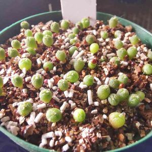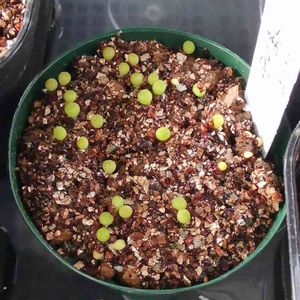 『フライレア狸の子』実生 ↙花終わり花柄に種の入った狸の子直径2cm2個200円にて購入 2021.11.08 種まき、腰水 11.15 2粒発芽 11.20 ほぼ全部発芽 2022.04 数個ジュレる 現在明るい日陰で腰水と霧吹きで約3mm程にまで育つ お母さん狸の子は今年も花芽が付いています