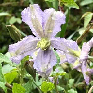 クレマチス 'ホワイトプリンスチャールズ' 曇り空の朝 蝉は鳴いてなく虫の声だけが聞こえてます