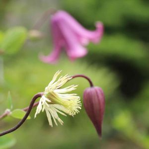 ヴィオルナ系(新枝咲き・強剪定タイプ) 作出者 : 小沢一薫(日本) 1990年作出 花 期 : 5〜10月 花 径 : 約4cm 樹 高 : 2〜4m前後(伸びる範囲・剪定で調整可能) 耐寒性 : 強 耐暑性 : 中 日 照 : やや半日陰 花径4cmほどのベル咲き。ピンクの覆輪で中央は筋が細かく入り白く抜けたような可憐な花。花期の長い多花性。 テキセンシスとヴィオルナの交配種で生育旺盛。花後の強剪定で繰り返し咲く。