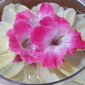 早朝のお庭のお手入れ終了 牡丹のはなびらと ペラルゴニウムで 花遊び