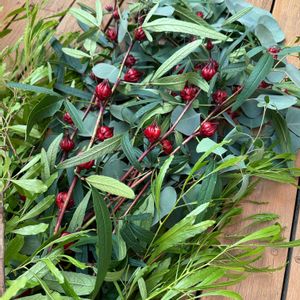 バックヤードからドドナエア、ユーカリポポラス、ピンクローゼル🩷 ドライになってもなお可愛い子たちを育てています😊 ローゼルはカリカリ梅風にしてみよう、熱いご飯🍚にもおにぎり🍙にも最高😃❣️ 塩の分量は種を除いてガクまで含めた赤い実の10%