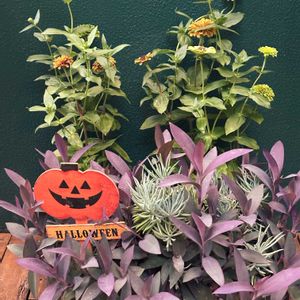 急に秋🍂😊 1.小さなハロウィン🎃、ジニア クイーンライムとクイーンライムオレンジ、紫御殿、美空鉾 2.3.ジニアクイーンシリーズ 4.紫御殿、セトクレアのお花 5.真ん中のコリウス は葉挿しの子、マーティ いつもは脇役のムラサキゴテンがハロウィンでは主役級😊 ポキポキ折れて挿せば全部着く元気さは凄い😃日当たりで紫💜 ネットからℹ️ ムラサキ御殿の名前の由来は茎・葉・花に至るまでほとんど全部が紫色をしているためです。 花が咲くとその部分の成長は止まり、下の節から分枝してさらに集散花序をつけ開花します。このような経過を連続して辿る事から、開花後の茎がジグザグと不規則な動きをするためごちゃごちゃとした見た目になる可能性もあります。→だから増え過ぎると直ぐにジャングルになるのね、納得😅 セネキオ属の美空鉾(みそらのほこ) 高温多湿は嫌い、霜には強い。 増やし方は 土に挿す:節を10センチくらいにカット、切り口を数日間乾かす他の多肉植物と異なり、セネキオ(美空鉾)は乾きに弱いため、切ったらすぐに水はけの良い土に挿します。土はビチャビチャにならないよう、少し湿っている程度に保ちます。