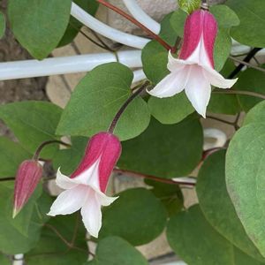 エール フクシマ(クレマチス) 「プリンセスダイアナ」から生まれたテキセンシス系四季咲きクレマチス🥀 GSを始めた一昨年と昨年は、住宅街のよそ様のフェンスに咲くベル型のお花を楽しみにお散歩していましたが、今年は我が家でも見られることになりました🥀 タグには「品種の特性:花後、地上部から20㎝位で切り戻すと繰り返し花が楽しめます」と‥ 。 ゚(((lll´艸`)〜コ、コレハ緊張スル〜・゚・マダサキダケド💦 🏷うつむく花♪ 🏷️蕾ちゃんちゃん♪