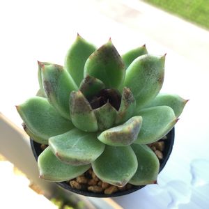 今日の一枚 エケベリア ブラックローズ (正式名称 ロスラリス)らしい 今日はお母さんぢゃなく子株ちゃんが主役❣️ だってお母さんよりべっぴんさんになってるんだもん🤣 独り立ちしてもいい位大きくなってるけど,秋までこのままかな… ブラックと言うよりブラウンで縁取りが白っぽくて輪郭の強調が凄く良き❣️ この子いっぱいにしたいなぁ☺️