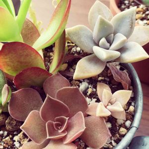 おはようございます☀ 以前カット苗を買って寄せ植えしたのですが、名前不明😅 右上の子はブロンズ姫❓かなぁ。じゃ、下の子は誰だろう… 誰か教えて下さい♪( ´θ`)ノ