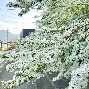 ユキヤナギ こっちはご近所の大きなユキヤナギ♪ 小さな花がたくさんついた枝が風に揺られて見応えあります(*゚▽゚*))