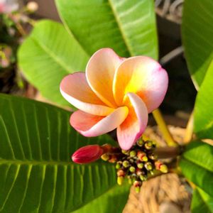 夕方仕事から帰ると… プルメリアの花がお迎えしてくれました♪ 2番花茎の最初の花♡ とってもいい香りなの〜╰(*´︶`*)╯♡