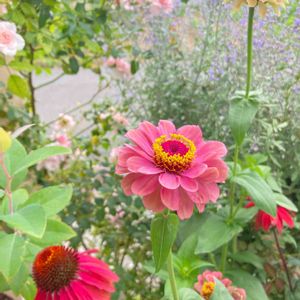 雨が続きます。昨日のエキナセアとジニア。ジニアの花芯から青虫さんがニョキと顔出してました😅良い色に惹きつけられたのかな。