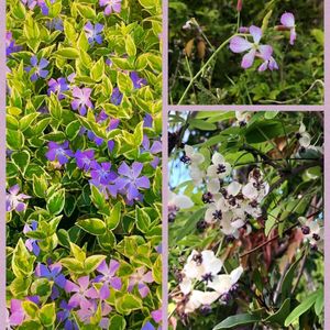 浜辺に咲く パーポー💜なお花 集めてみましたぁ😊🌿 ツルニチニチソウ(左) ハマダイコン(右上) アケビ(右下)