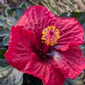 🌺ハイビスカス🌺 夏に咲いていたときは 濃いピンクでしたが 今朝開いた花は 真っ赤でした 多分、シーズン最後の花