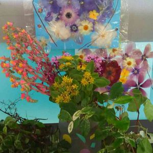 エケベリアの花 キリンソウ ラベンダーラス シドイデス ハツユキカズラ エケベリアの花をアレンジ しました。 奥は押し花のラミネート です♡