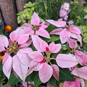 ポインセチア プリンセチア この時期になるとついつい欲しくなって買っちゃいます。クリスマスが近くなったな~😉👍️✨ GSを始めてから ポインセチアが冬を越せると知り、ただ短日処理をしないと葉も綺麗に色つかないことも知り、 段ボールで蓋をしたり、夜になると鉢を移動したり頑張った時期もありましたが😅 今はこんな感じ😅 1️⃣今年のピンクのプリンセチア 2️⃣赤 3️⃣オレンジ 4️⃣白 何もしないとてっぺんの葉っぱがちょろりと色づきますが、 緑の葉っぱが多いです~。
