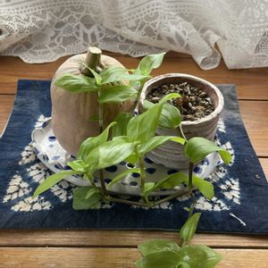 おはようございます😃 実家の庭にあったトキワツユクサの枝を頂いて、花瓶にさしていたら、根が出たので、小さな鉢に植えました。だいぶ伸びてきました。 友達から頂いた、ひょうたんかぼちゃと飾ってます。