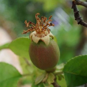 今日のお花 カリン🩷💚 4月にきれいに咲いていたお花に実が付きましたが手入れしてないので虫食いの実🐛
